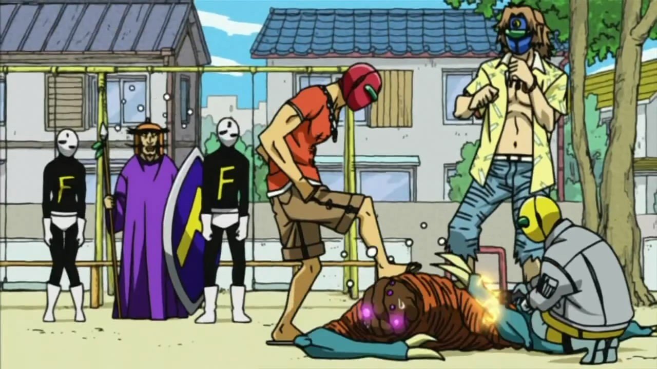 Описание: Главный супергерой Санред кроме борьбы с монстрами ничего не умеет, да и не хочет делать. Поэтому он и сидит на содержании у своей подруги и с неохотой появляется на стрелках с местными злодеями. В общем, очень обленившийся Онизука в маске. Остальные супергерои показаны тоже далеко не благородными рыцарями "без страха и упрека". С другой стороны, монстры здесь показаны очень ценными и полезными членами общества. Единственные отличия их от среднестатистического японца это слегка необычная внешность, да и желание поработить мир, но сугубо гуманными и пацифистскими методами, не нарушающими экологию и покой граждан. Возглавляет Кавасакское отделение генерал Вамп очень чувствительный, хозяйственный пожилой злодей, который кстати ведет свое кулинарное шоу. Противостояние с Санредом у него заключается в том, что генерал постоянно получает по шее от супергероя, ходит к нему в гости, помогает ему по дому и является эталоном добропорядочного хозяина и джентльмена для его подружки. Как вы понимаете из всего выше написанного стиль сериала пародийный, но возможно он будет более интересен зрителям разменявшим второй десяток из-за многочисленности бытовых зарисовок. Хотя сцены с плюшевым отрядом террора подойдут для любой возрастной группы.