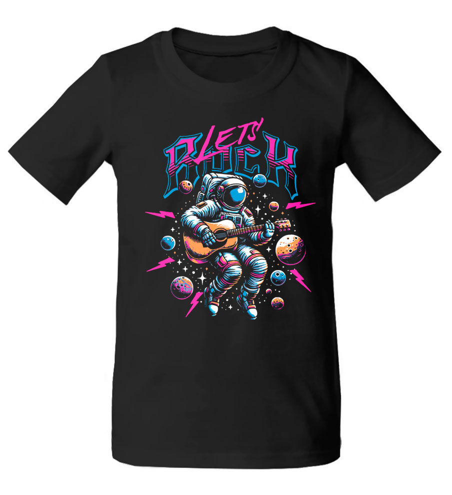 Футболка с ярким принтом, который сразу привлекает внимание. На груди изображен космонавт с электрогитарой, а вокруг него - звезды и надпись “Let’s Rock” (“Зажжем”). Изделие выполнено из качественной ткани, приятной на ощупь. Эта футболка станет отличным выбором для любителей рок-музыки и космических тем.