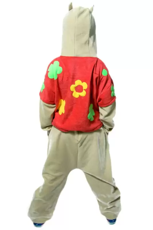Описание:  Комбинезон на пуговицах с капюшоном и боковыми карманами. Шнурки на капюшоне для фиксации. Съемные варежки пришиты к рукавам. Резинка внизу штанин и рукавов. Некоторые детали персонажа выполнены с наполнением синтепоном (хвост, мордочка и т.п.).