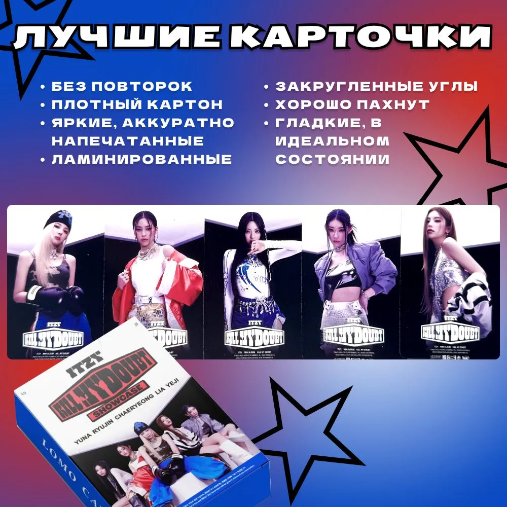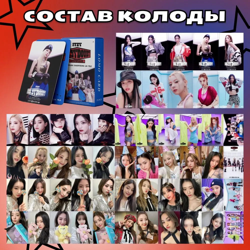 Карты Итзи, с фотографиями участниц коллектива, исполняющего в стиле кпоп. Посвящены выходу ITZY KILL MY DOUBT. В набор карточки итзи входит 55 шт. В каждом комплекте k-pop карточек моменты из жизни участников культовой команды, радующих своим творчеством в стиле кпоп фанатов по всему миру. Подойдёт для тех кто любит карты к поп и ищет фото с корейскими группами и карточки айдолов.