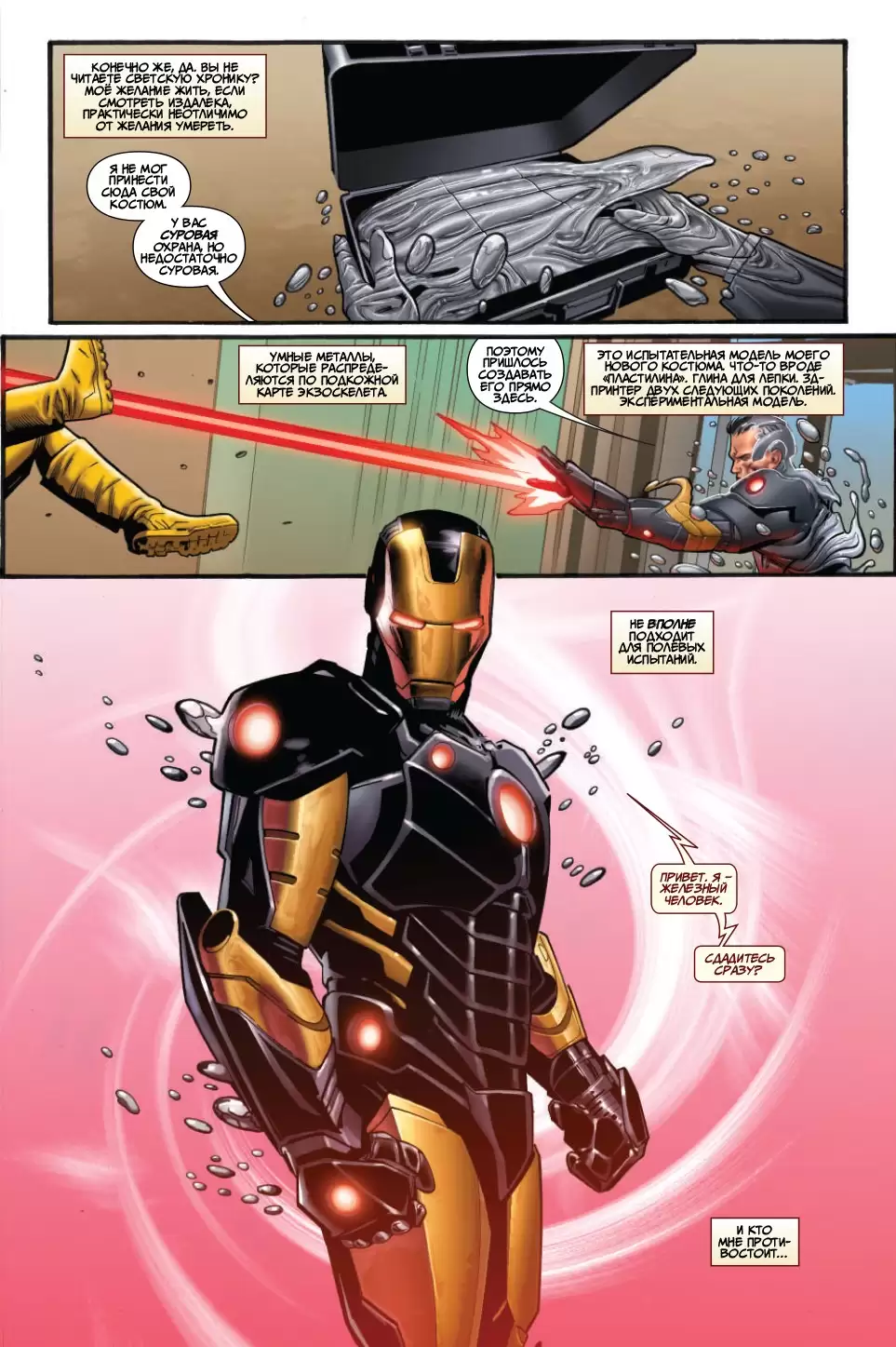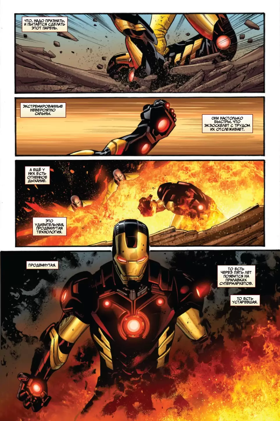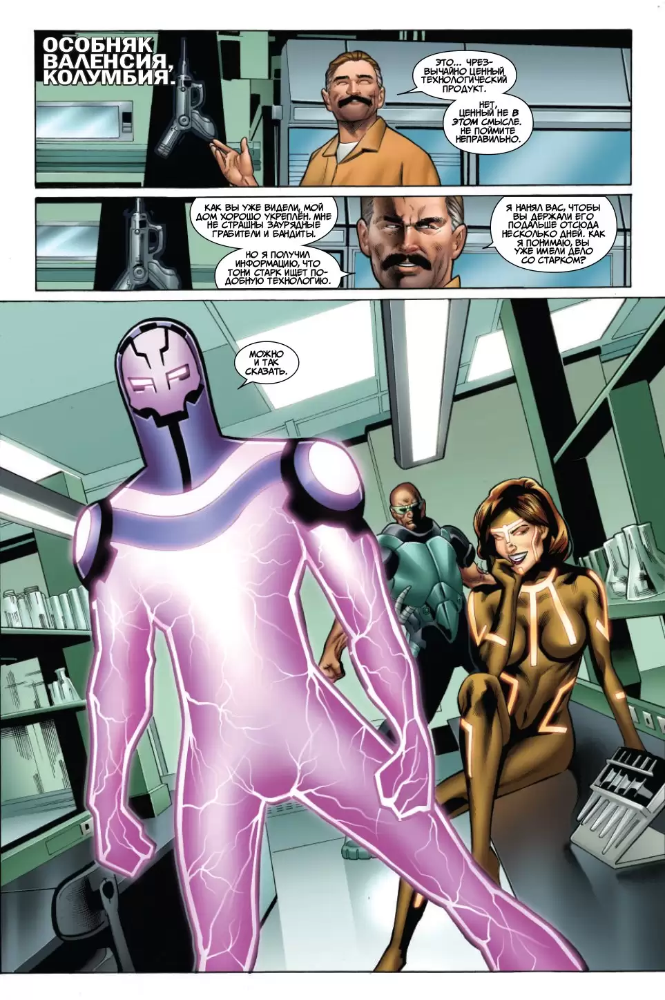 Тони Старк - это Железный Человек, технологический провидец, богатый плейбой, бесподобный инженер и бронированный Мститель. Но теперь самая мощная модификация брони Железного Человека стала самой большой опасностью для мира: смертельный техновирус Экстремис оказался на воле! Пока Тони будет охотиться за комплектами Экстремиса, он побывает в Новом Авалоне, где столкнётся в битве с робо-рыцарями, называющими себя "Кругом", сойдётся в рукопашном бою с российской академией экзоскелетов Блэк; в Колумбии, где сразится со старыми врагами Вибро, Клеймо и Живым Лазером; и в древних катакомбах Парижа, где его ждёт самый настоящий ужас, и, возможно, Тони придётся предать старого друга! В этом комиксе представлены маскировочная броня Железного Человека, тяжёлый боевой костюм и космическая модификация. Тони создаёт новую броню, чтобы дать ответ новым вызовам! Если он собирается спасти мир от собственного смертельного нановируса, то Железный Человек должен действовать быстро, а Тони Старк - создавать костюмы ещё быстрее!