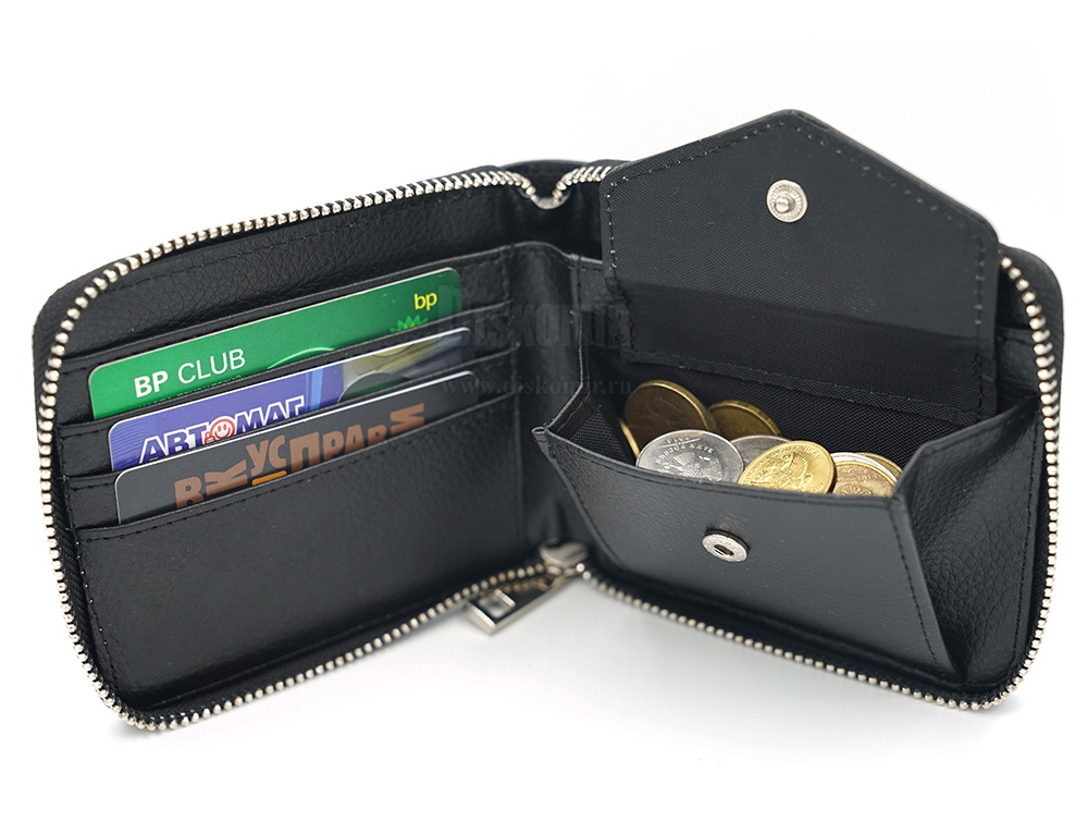 Компактный, удобный кошелёк на молнии, который отлично умещается в кармане. Внутри одно отделение для купюр, один карман для мелочи с клапаном на кнопке и три кармана для пластиковых карт.