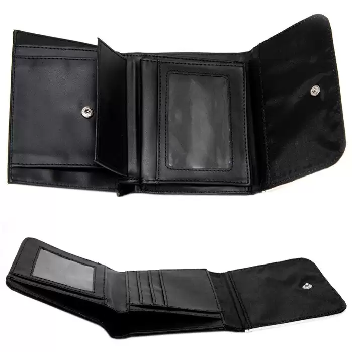 Компактный, удобный кошелёк, который отлично умещается в кармане. Внутри одно отделение для купюр, один карман для мелочи с клапаном на кнопке и три кармана для пластиковых карт.