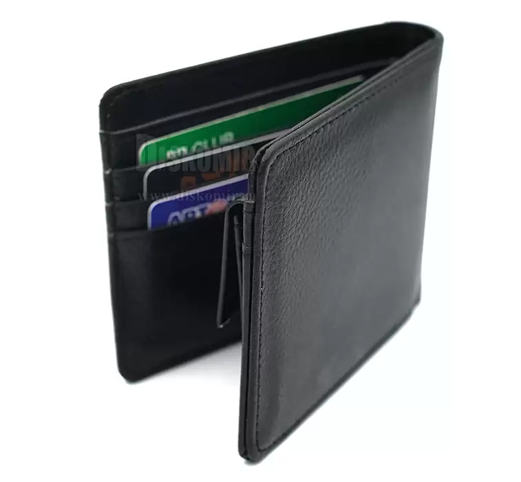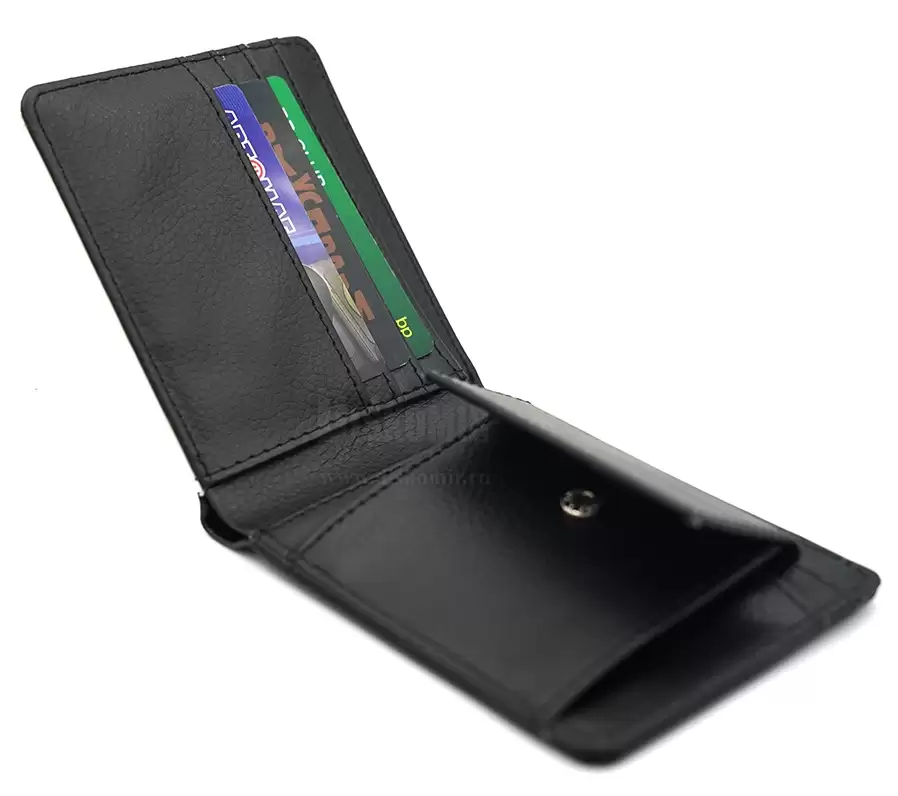 Компактный, удобный кошелёк, который отлично умещается в кармане. Внутри одно отделение для купюр, один карман для мелочи с клапаном на кнопке и три кармана для пластиковых карт.