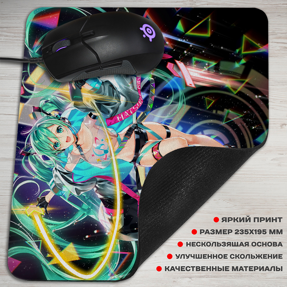 Коврик для мышки прямоугольной формы с изображением главных персонажей игры “Проект Секай” и известной певицы Hatsune Miku, которая является главным героем игры. Коврик подходит для использования в играх и работе с компьютером.