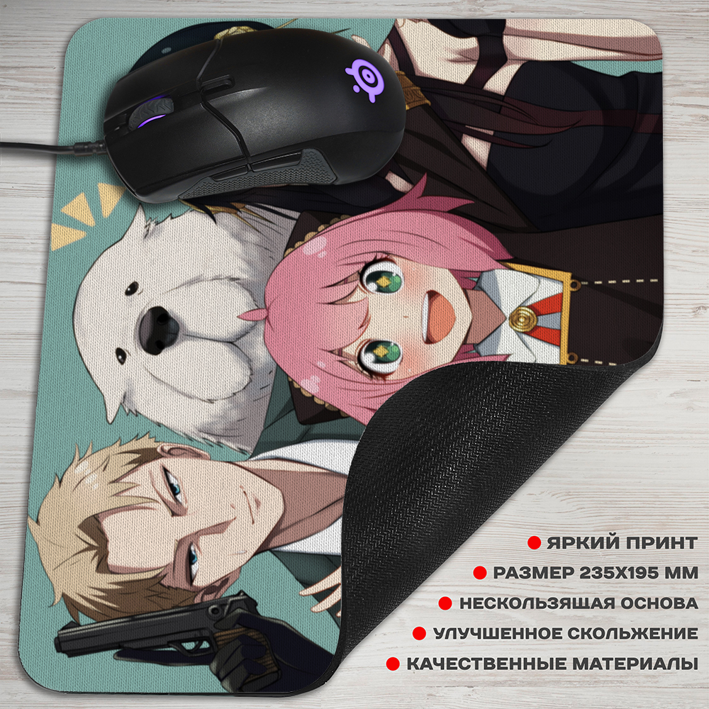 Коврик прямоугольный для мыши из аниме Семья шпиона, это один из самых нужных аксессуаров, если у вас есть компьютер. Верхнее покрытие из специальной ткани с крутым артом из аниме, обеспечивающей улучшенное скольжение мыши по коврику. Для того чтобы аксессуар надежно фиксировался на поверхности стола, он оснащен прорезиненным основанием.