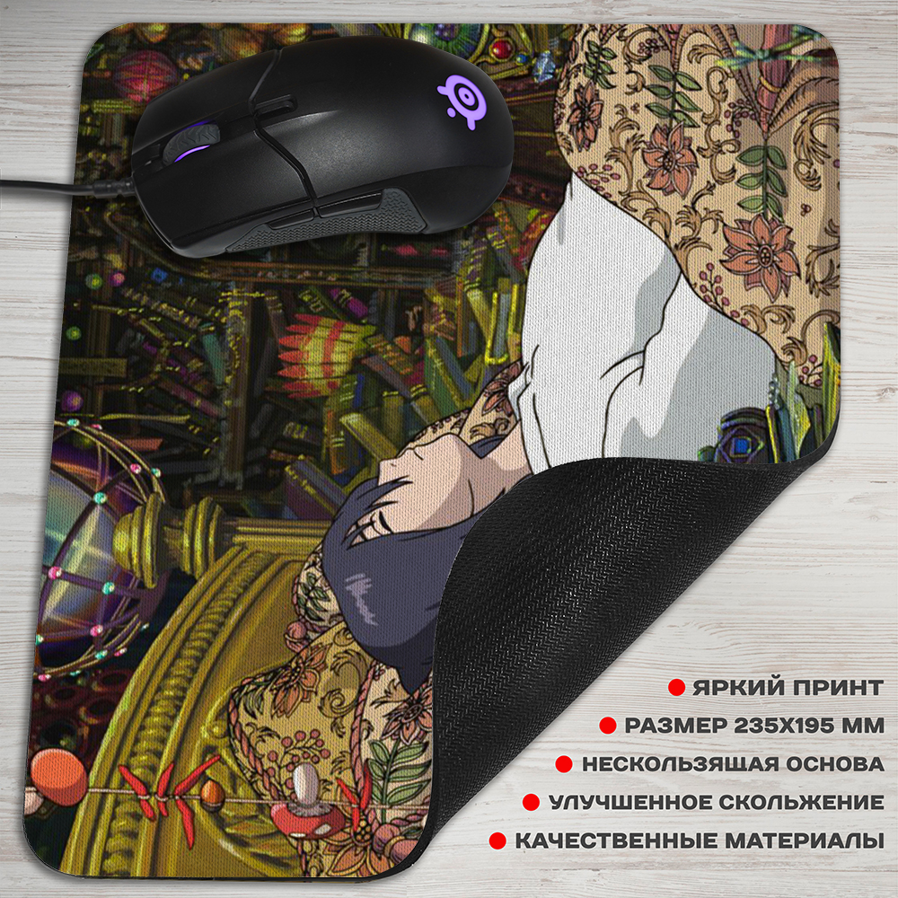 Коврик для мышки с рисунком из аниме «Howl's Moving Castle». На нем изображен Хаул, восстанавливающийся после тяжелой битвы. Этот герой – величайший маг, о котором ходит множество ужасных слухов. Но, попав в его замок, героиня быстро понимает, что все они – выдумка и герой на самом деле очень одинок. В его лице Софи находит не только поддержку, но и свою любовь.