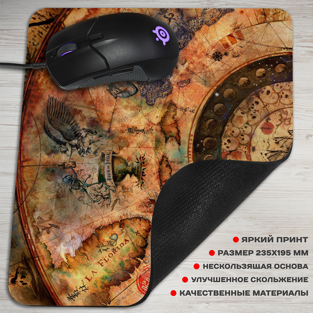 Коврик для мышки с картой из «Pirates of the Caribbean». Это история о приключениях двух непохожих героев – Уилла, пытающегося спасти свою подругу детства, и Джека – харизматичного авантюриста, корабль которого был украден. Вместе они преследуют капитана Барбоссу, над которым висит ужасное проклятие. Он и его команда при свете Луны превращаются в живых скелетов.