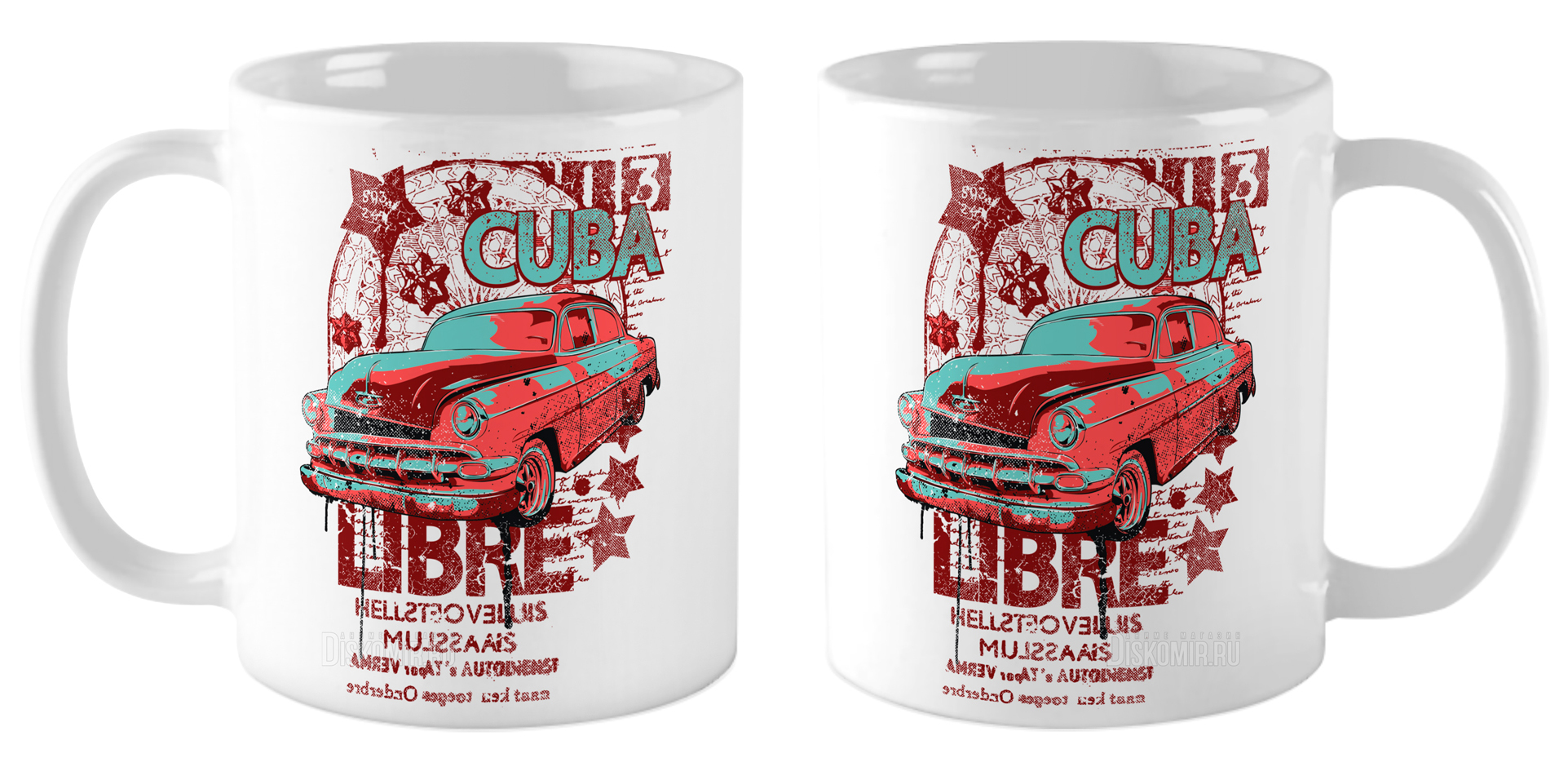 Керамическая белая кружка объёмом 330 мл с изображением ретро автомобилей в стиле Cuba Libre. Прекрасный аксессуар для любителей автомобилей и стильного дизайна.