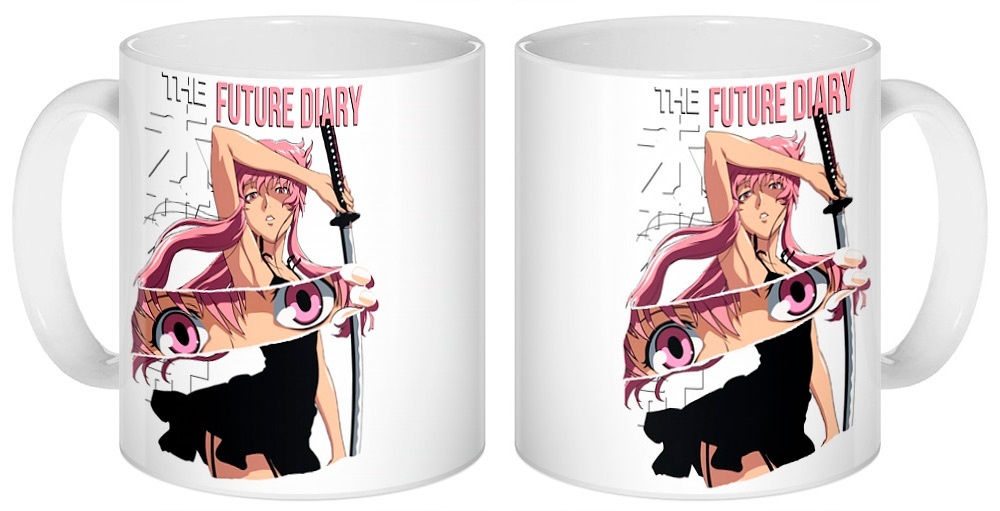 Кружка с изображением главной героини из аниме «Mirai Nikki» Юно Гасай. Из-за тяжелого детства девушка имеет психологические проблемы и влюбившись в Амано во всех красе раскрывает своего внутреннего социопата.