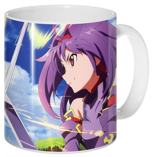 Кружка с артом из «Sword Art Online». Эта история близка многим отаку, увлекающимся ММО-жанром в играх. Согласно сюжету аниме, появляется новый проект, позволяющий использовать шлемы виртуальной реальности. Но, попав в него, герои уже не могут выйти в реальный мир. Они должны пройти игру до конца и победить финального босса, иначе их ждет настоящая смерть.