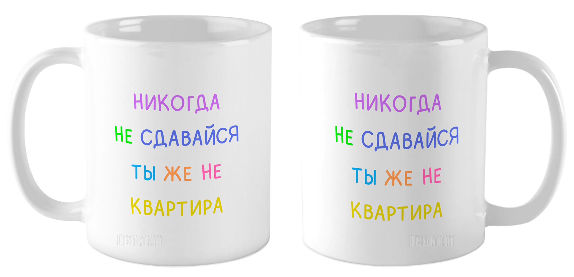 Кружка "Никогда не сдавайся, ты же не квартира" - идеальный компаньон для тех, кто не боится вызовов и готов бороться до конца. Изготовлена из прочного керамического материала, обладает удобной ручкой и вместительным объемом. Этот мотивационный аксессуар станет отличным подарком для целеустремленных и настойчивых личностей, которые всегда идут к своей цели. Не сдавайся, держи кружку в руках и двигайся только вперед!