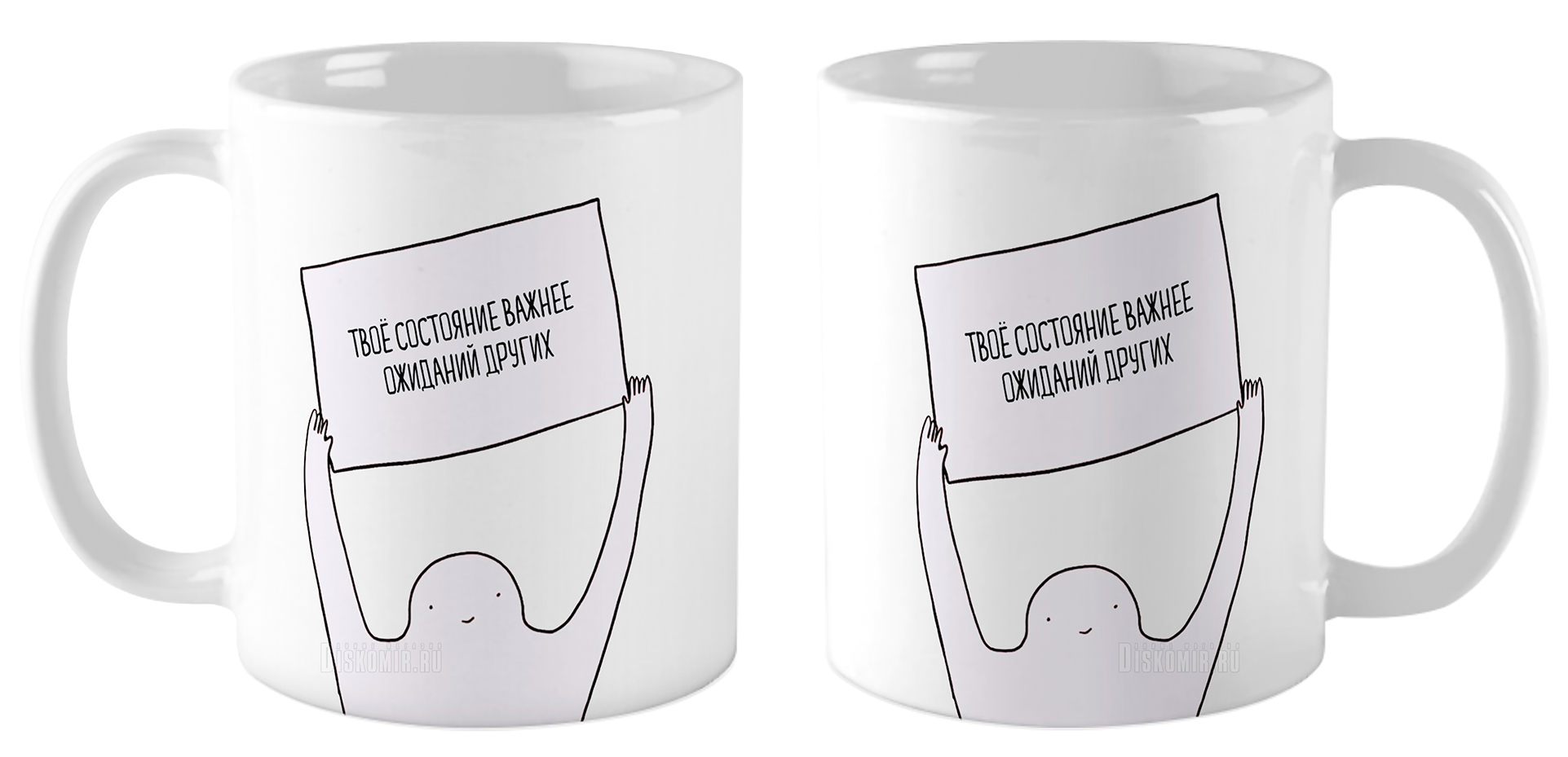 Просыпаясь утром и наливая в нее свой любимый напиток, ты напоминаешь себе о важности своего собственного состояния. Кружка "Твоё состояние важнее ожиданий других" станет твоим ежедневным напоминанием о том, что главное - быть верным себе. Изготовленная из качественного материала, она прослужит тебе долгие годы, наполняя каждый день позитивом и уверенностью в себе.