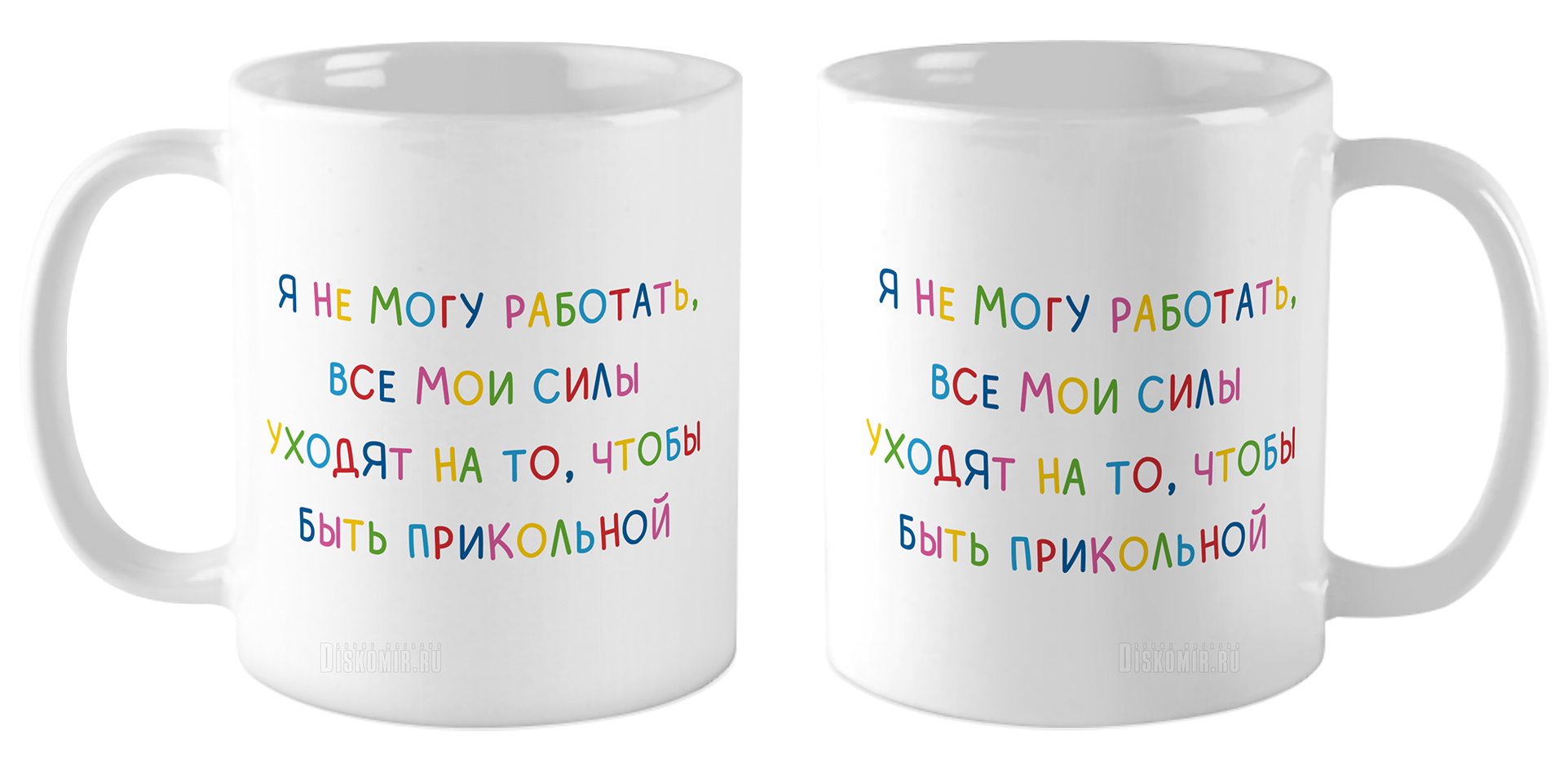 Кружка "Я не могу работать, все мои силы уходят на то, чтобы быть прикольной" - отличный подарок для людей, которые ценят юмор и не боятся быть оригинальными. Изготовлена из качественного керамического материала, имеет удобную ручку для комфортного использования. Данная кружка станет отличным дополнением к вашему утреннему кофе или чаю, а также станет забавным аксессуаром на вашем рабочем столе. Подарите себе или своим близким порцию хорошего настроения с этой кружкой!