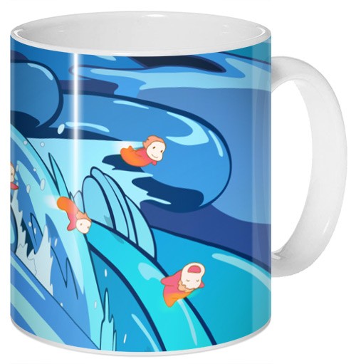 Кружка с артом из «Gake no Ue no Ponyo». На берегу моря мальчик Сооске однажды находит маленькую рыбку, нуждающуюся в помощи. Она – дочь морской богини и живет недалеко от главного героя. Дети начинают дружить и Поньо влюбляется в мальчика. Теперь она хочет во что бы то ни стало стать человеком, но возможно ли это?