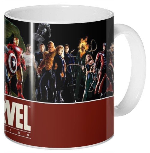 Кружка с героями студии «Marvel». На ней разместились самые известные из них, не раз появлявшиеся в хитовых блокбастерах. Среди них Железный человек, Человек-паук, герои «Великолепной четверки», «Людей Икс» и многие другие. Все они стали невероятно популярными как герои комиксов и одноименных фильмов, неустанно штурмующих кинотеатры мира.