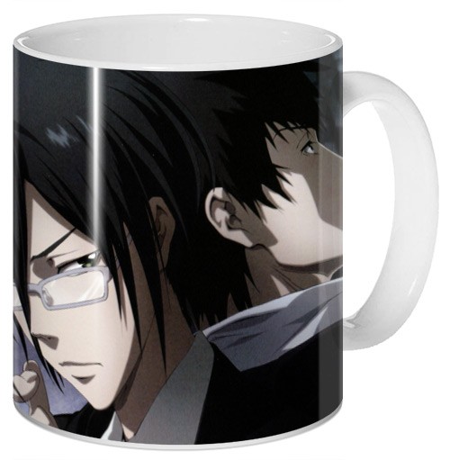 Кружка с героями «Psycho-Pass». На ней хорошо заметна Аканэ Цунэмори, протагонист истории. Девушка попадает в полицию благодаря своим высоким оценкам. Тут ей уготована роль инспектора, который руководит потенциальными преступниками, специально отобранными «Сивиллой». Они – команда, способная распутать даже самое сложное дело.