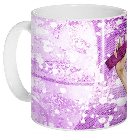Белая керамическая кружка с ярким, насыщенным рисунком.