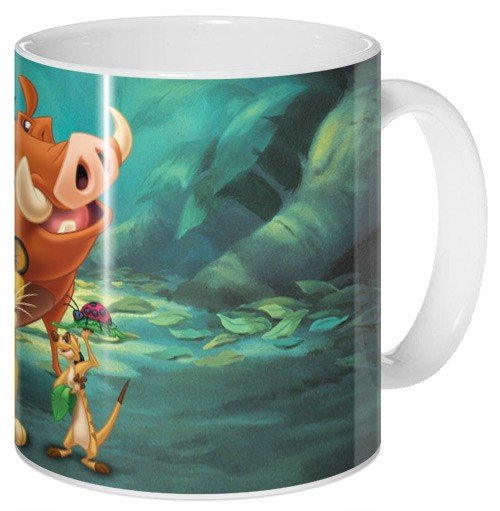 Кружка с героями «The Lion King». На ней нанесен момент из детства Симбы, когда он только познакомился со своими новыми друзьями – Тимоном и Пумбой. Он, одолеваемый угрызениями совести, долгое время провел с сурикатом и бородавочником, скрываясь от родного прайда. Но не за горами то время, когда герой вернется и вступит в законные права наследника.