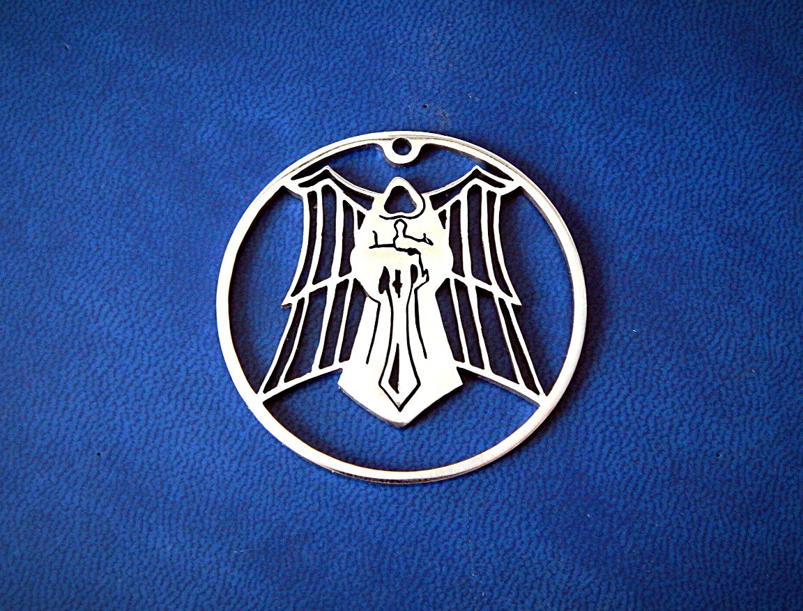 Уникальный кулон из популярной игры Warhammer 4000 - Тёмные ангелы. Изготовлен из прочного металла с детальной проработкой каждой линии и узора. Отличный подарок для поклонников фэнтезийных миров и коллекционеров. Носите это украшение с гордостью и покажите свою преданность легендарным Тёмным ангелам.