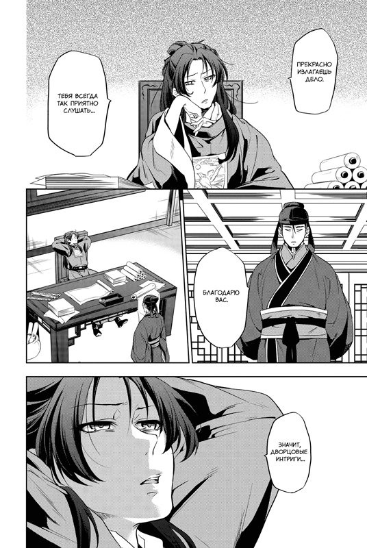 В книгу вошли 3-й и 4-й тома оригинальной манги, 13 глав: «Умозаключения Маомао», «Зачем дарят шпильки», «Возвращение в родную гавань», «Соломинка», «Недоразумение», «Вино», «Поручение для Маомао», «Мед» (1-2), «Наложница Адо», «Недопонимание», «Евнух и девушка для утех», «Собирая узелок». Книга соответствует второй половине 1-го тома оригинального ранобэ.