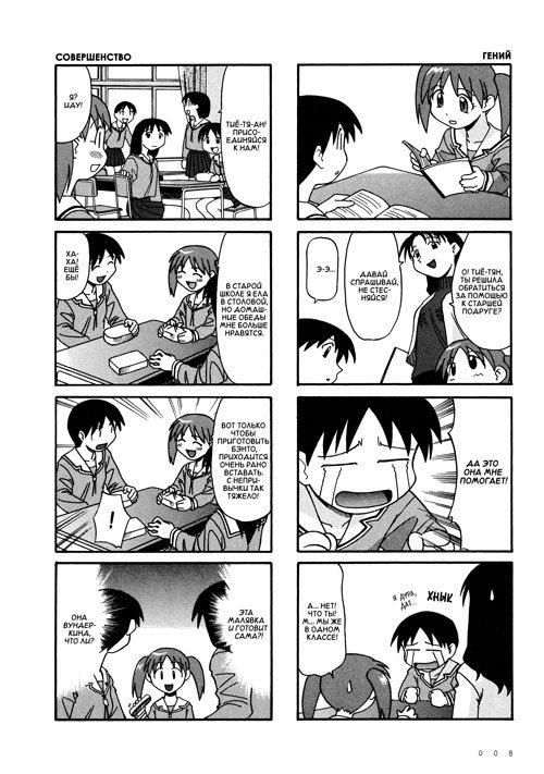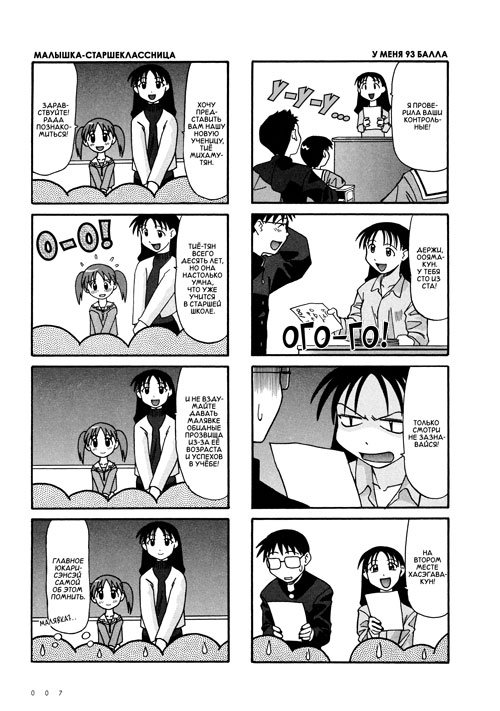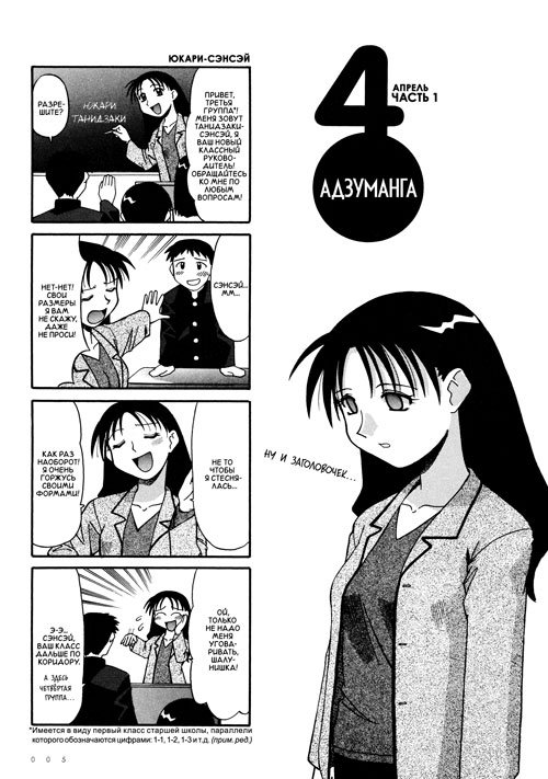 Истории из жизни обычных японских школьниц. В новом учебном году ребята впервые идут в старшую школу, встречают старых друзей, знакомятся с новыми. В манге фигурируют умный Тио, слегка заторможенная Осака, молчаливая Сакаки, сумасбродная Томо, застенчивая Каорин и заучка Ёми. Всех их ждут веселые приключения новом классе. Лицензия: ASCII Media Works (Япония) Порядок чтения: Справа налево Отзеркалено: Нет