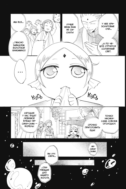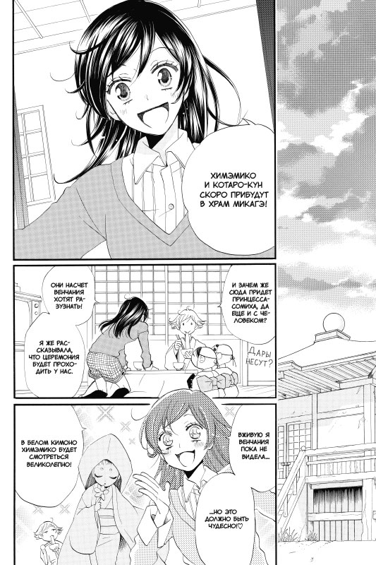 Уж сколько раз твердили миру — отношения между духом и человеком грозят обернуться множеством бед! И все же Болотная Химэмико, влюбившаяся в смертного по имени Котаро, верит, что им повезет. Нанами всячески поддерживает подругу и хочет помочь влюбленным, обвенчав их в храме Микагэ. Но, конечно, без неприятностей не обходится: к Химэмико сватается другой дух, Драконий Карп Нисики, который не терпит отказов...