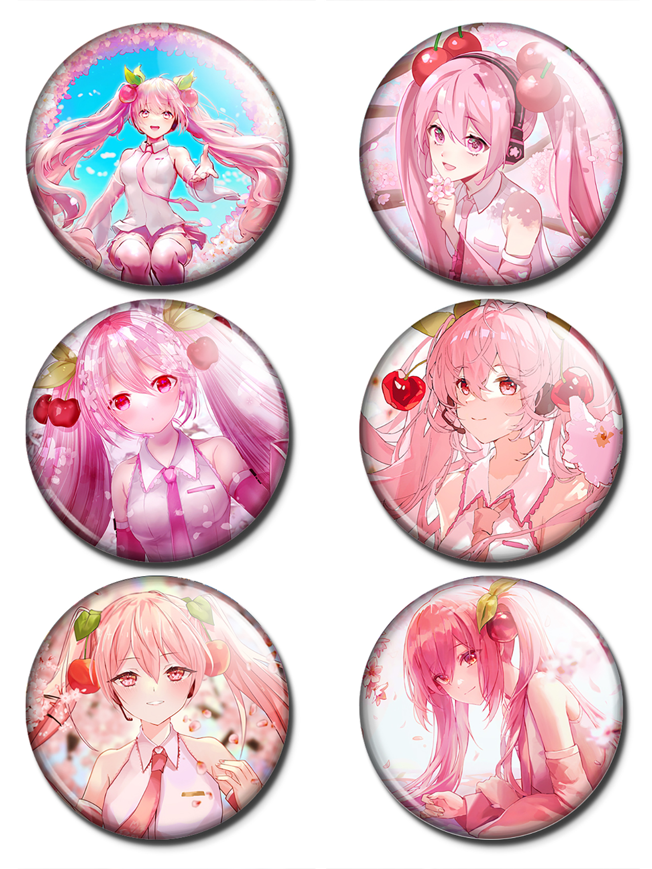 Набор значков с центральным персонажем серии «Вокалоид» - Хатсунэ Мику. Девочка была первым маскотом серии данного вокального софта и с тех пор не теряет своей бешеной популярности. За время своего существования она стала настоящей звездой, выпускающей новые песни и дающей концерты. В данном наборе она предстала перед зрителями в своих разных образах.