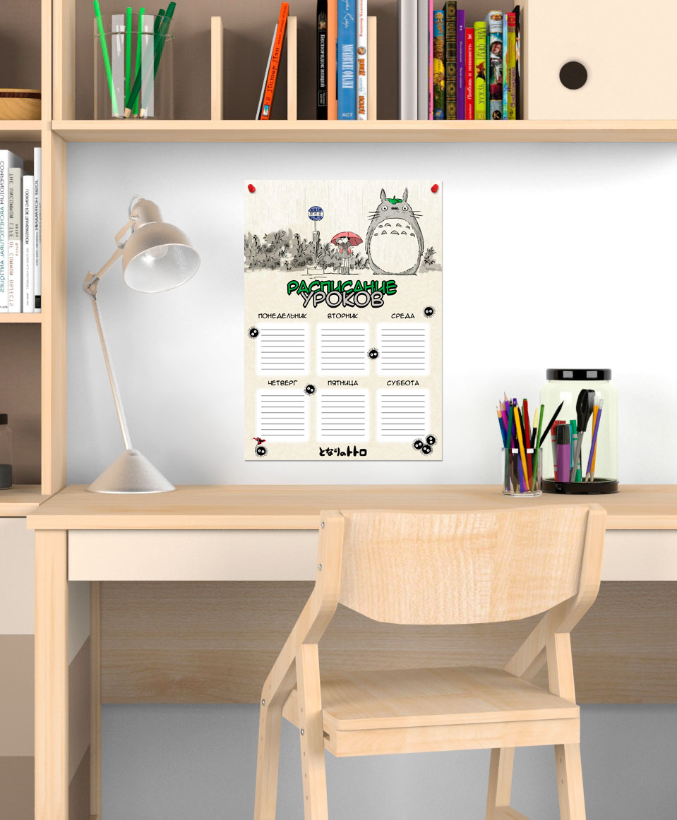 Школьное расписание с артом из My Neighbor Totoro прекрасно подойдет для украшения рабочего места школьника! Расписание уроков - это отличный способ помощи школьнику в организации своего учебного процесса. Имея перед собой расписание уроков на каждый день, ученик никогда не забудет взять в школу все необходимое. Это добавит ему уверенности в себе и положительно повлияет на учебный процесс, а яркий принт с любимыми героями будет радовать каждый день!